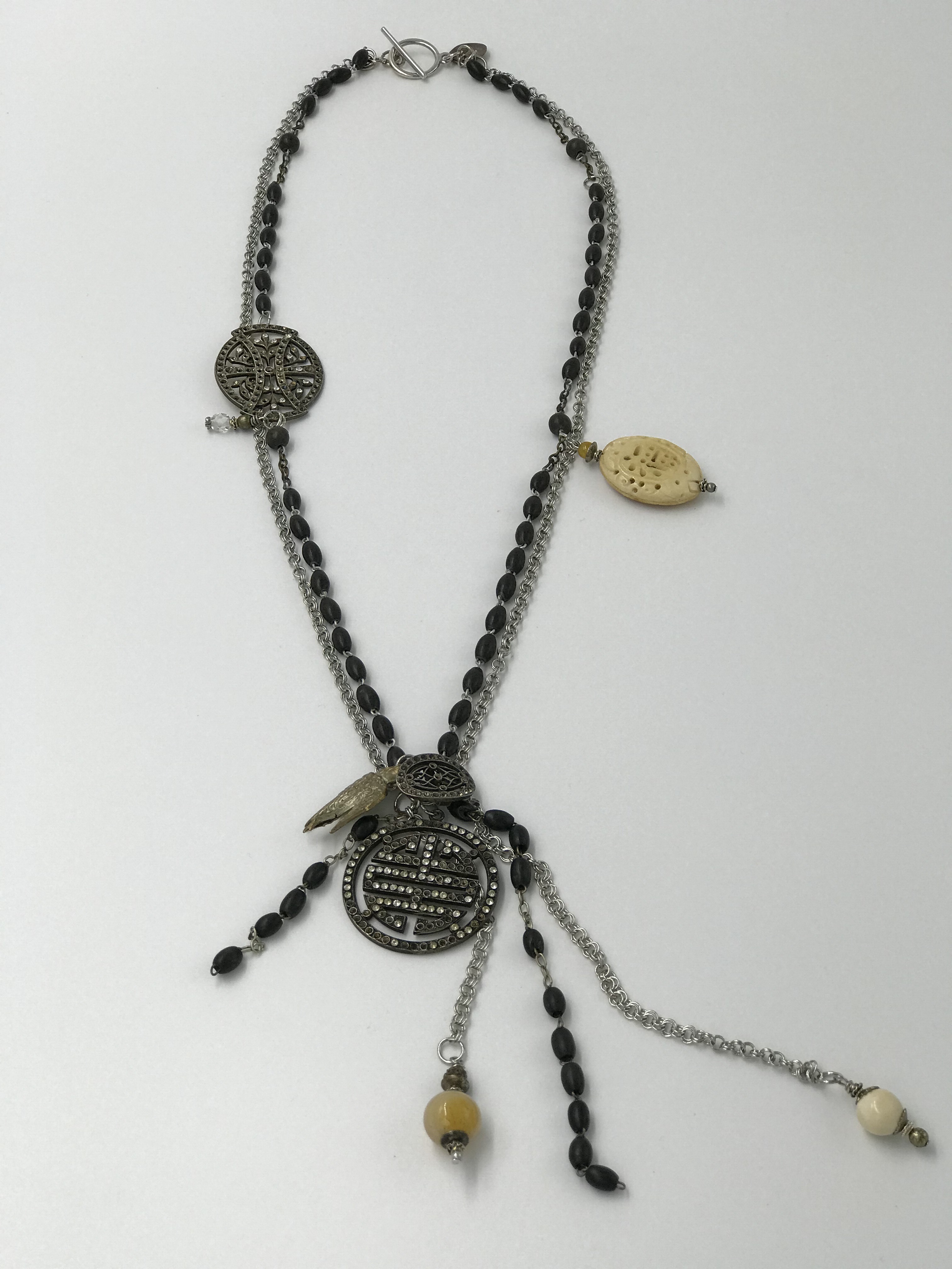 Ce collier est constitué d'éléments vintage, fragments de broches en métal, aux strass clairsemés, petit oiseau de métal, perle d’os gravée, perle végétale et perle d’agate. Pièce unique.