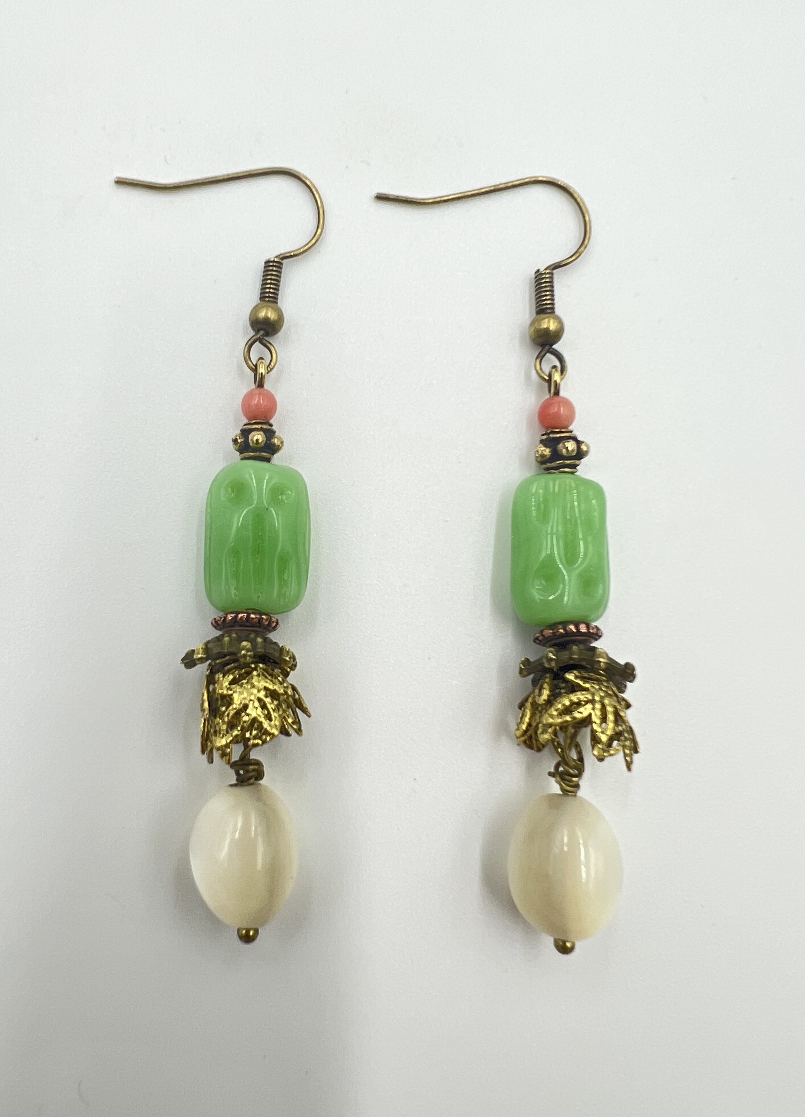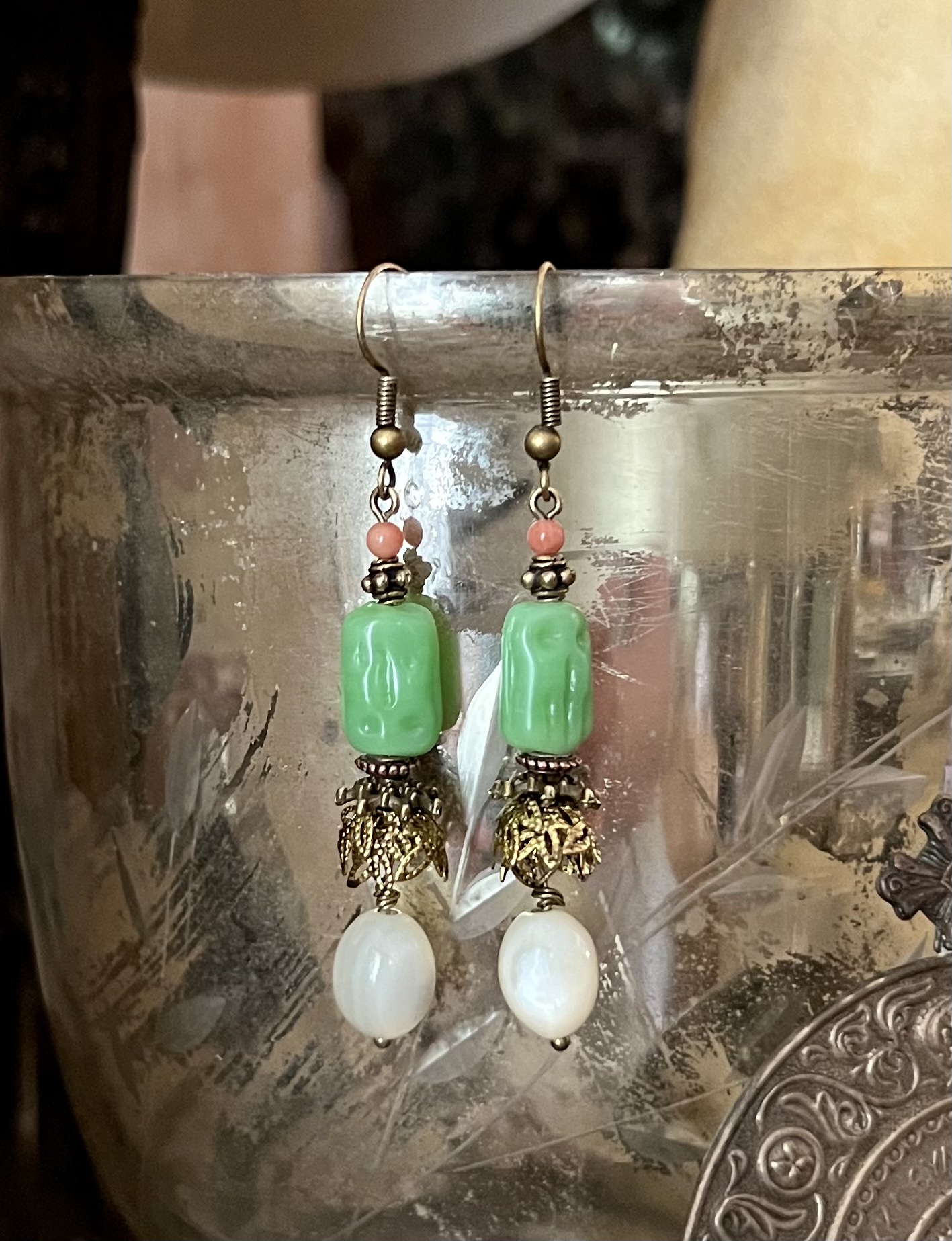 Cette paire est constituée de petites perles en corail, de perles de verre vintage et de perles en nacre. Pièce unique. Longueur des b.o : 6,7 cm